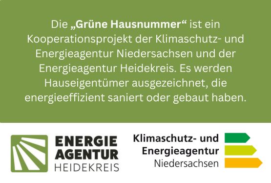 Im Heidekreis haben bereits zahlreiche Hausbesitzerinnen und Hausbesitzer mit gutem Beispiel vorgelegt und ihre Gebäude energieeffizient saniert oder neu gebaut. Dennoch besteht weiterhin großer Handlungsbedarf. Mit der Auszeichnung „Grüne Hausnummer“ möchten wir diese gelungenen Projekte anerkennen und stärker ins öffentliche Bewusstsein rücken. Vorbilder inspirieren – sie motivieren andere dazu, ihr eigenes Zuhause zu modernisieren und zukunftsfähig zu gestalten. Deshalb suchen wir engagierte Eigentümerinnen und Eigentümer im Heidekreis, die besonderen Wert auf einen sparsamen und nachhaltigen Energieeinsatz gelegt haben. Haben Sie Ihren Neubau als KfW-Effizienzhaus 40 oder sogar als Passivhaus realisiert? Wurde Ihr Bestandsgebäude auf ein KfW-Effizienzhausniveau saniert oder haben Sie gezielte energieeffiziente Maßnahmen umgesetzt? Dann dürfen Sie mit Recht stolz auf Ihr Zuhause sein – und das auch sichtbar machen!